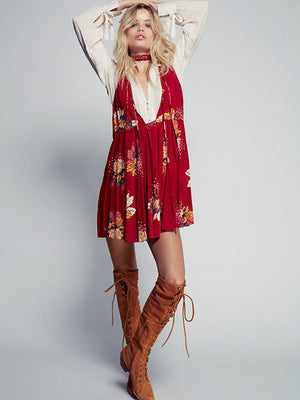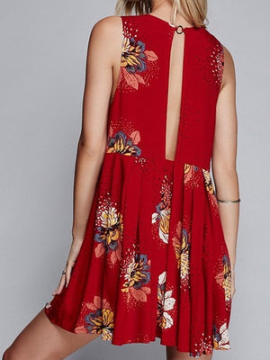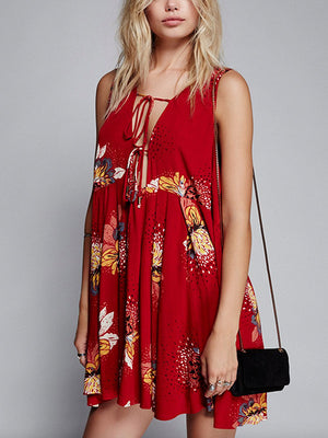 Flowy and printed sleeveless tunic featuring pleat detailing around the waist. Plunging neckline with tie detailing and a low open back.