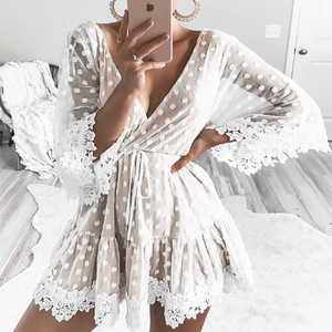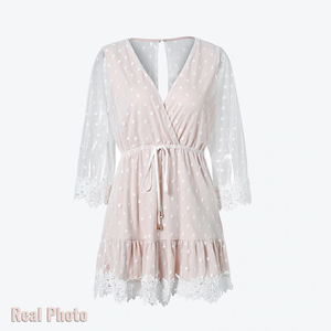 • Our She Wore Polka Dress features a deep V neckline, cut-out back with a button closure and it has an invisible back zip. This style has wide lace sleeves with crochet detailing and a drawstring waist with gold details for comfy wear. It also has a crochet hemline. Style yours with black booties and gold cuffs!