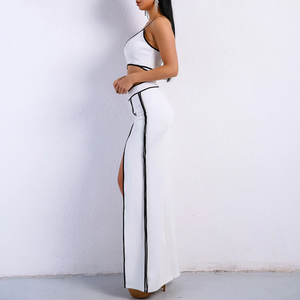 • Contrast black trim adds an edge to the sexy styling of this two-piece white jumpsuit set. The No Complaints jumpsuit features a spaghetti strap crop top with a cross wrap V-neckline, a center back zipper, and cut out accents on the back. The matching wide leg pants are detailed with black stripes down each side and high front slits that let you show lots of leg.