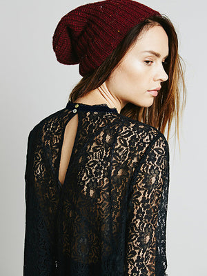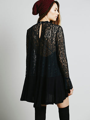 Romantic lace and crepe pieced tunic with a swingy silhouette. Front and back keyhole cutouts with mother of pearl button closures at nape and fluted bell cuffs. Sheer lace top and sleeves with crinkly crepe skirt. Styling Tip: This versatile top can also be worn as a super mini dress. For a no-show look layer with one of our seamless shorts for an effortless look.