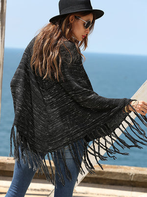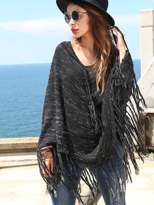 Battle the cold weather in style with this tassel poncho in black. This very stylish poncho features a very fashionable design, cute fitting, and tassel detailing on the hem. It also comes with a v-neck for versatility. Wear it with your boots andskinny jeans for a perfect summer or winter look.