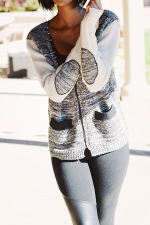 Stay warm and look trendy in our marled-knit zipper cardigan with studded detail down the neckline. This has a great look and is complimented by cute shoulder patched detail and a front zipper for easy in-and-out access.