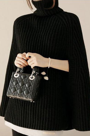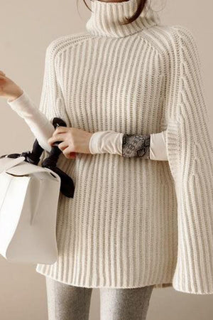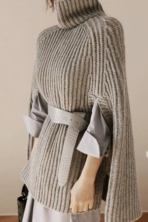 Bundle up into cozy comfort. An elegant Fall piece with high neck and slit sleeves in poncho style. With finely textured knit fabric, this plushy piece sums up fashion and function for this cool season